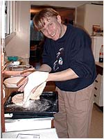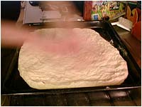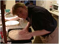 Etter første gangs heving må man fordele deigen utover en langpanne på best mulig vis. Her prøver Alf å vise bort sine fantastiske pizzakunster! |
