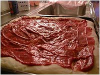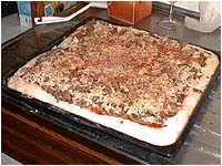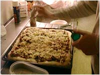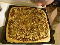 Og her ser vi hvordan han med sine godt opptrente ferdigheter kjærlig plasserer deigen på langpannen. |